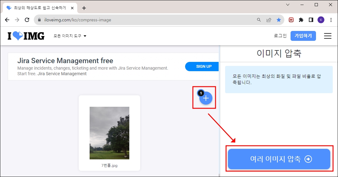 JPG파일 용량 줄이기를 위해 아래의 아이러브 이미지 웹사이트에 접속해 주세요. 회원가입 이나 로그인 필요 없이 JPG파일 용량 줄이기가 가능 합니다.
