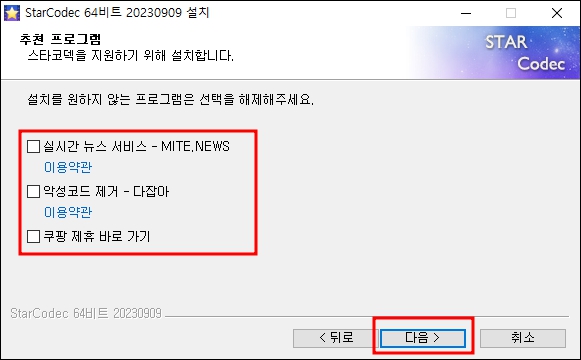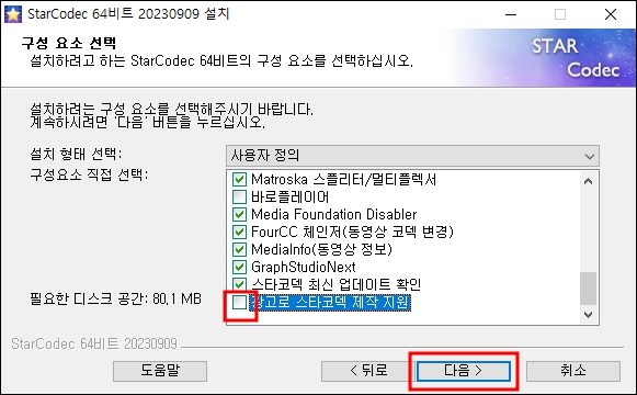 아래와 같이 구성 요소 선택 부분에서 아래로 내려서, 광고로 스타코덱 제작 지원 부분만 선택을 없애 주시고 계속 곰플레이어 통합코덱설치를 진행 합니다.