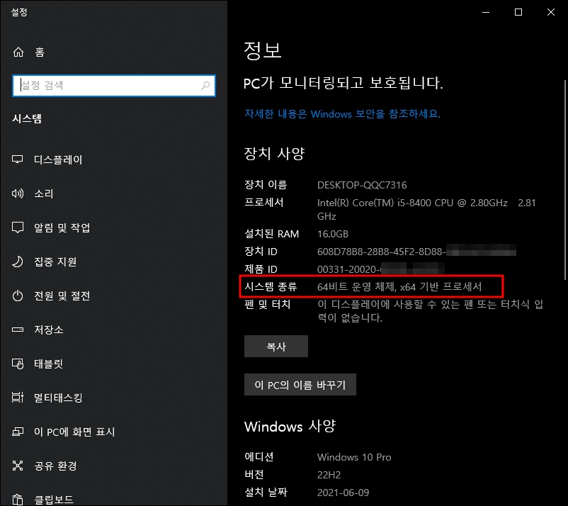 윈도우 + Pause 키를 누르면 아래와 같이 윈도우 설정 팝업이 나오며 정보를 보실 수 있습니다. 제가 사용하는 시스템은 윈도우10에 64비트 운영체제 임을 보실 수 있습니다.