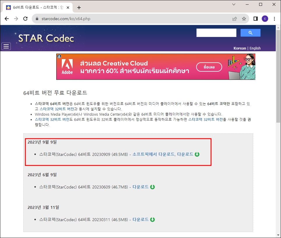 제 컴퓨터는 64비트이기 때문에, 저는 아래의 링크에서 통합코덱 다운로드를 진행하도록 하겠습니다.