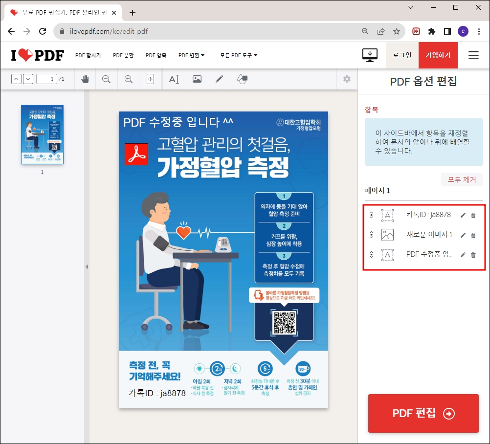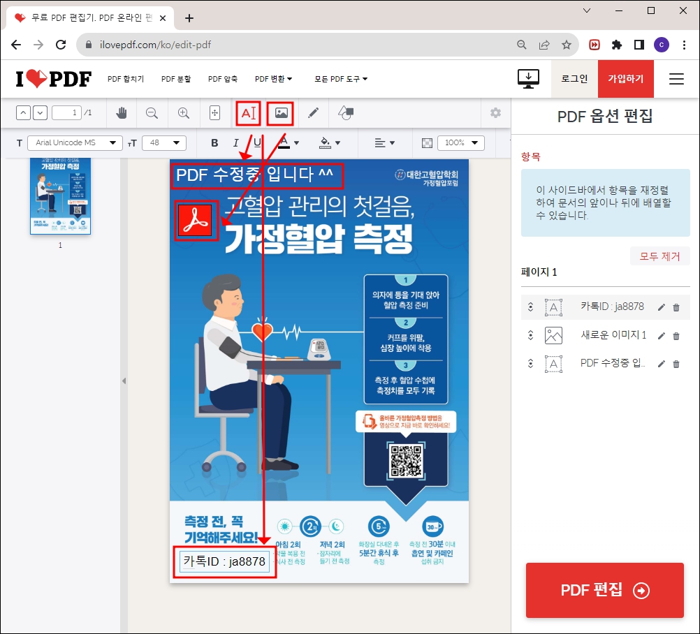 9) 편집에 완료되면 아래처럼 자연스럽게 편집이 된것을 보실 수 있으며, 각각의 편집에 대한 수정은 아래의 오른편에 있는 빨간 박스처럼, 기존 pdf 편집본의 수정이나 없애기가 가능 합니다.