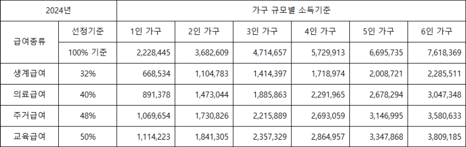 기초생활수급자 자격요건 - 2024년 급여 종류별 수급자 선정기준표