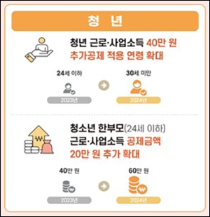 · 청소년 한부모(24세 이하) 근로·사업소득 공제를 40만 원+30%에서 60만 원+30%로 확대