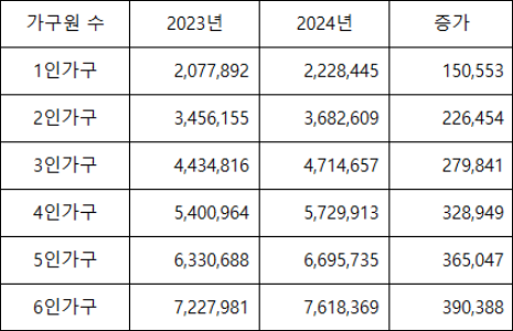 | 구분 | 1인가구 | 2인가구 | 3인가구 | 4인가구 | 5인가구 | 6인가구 |