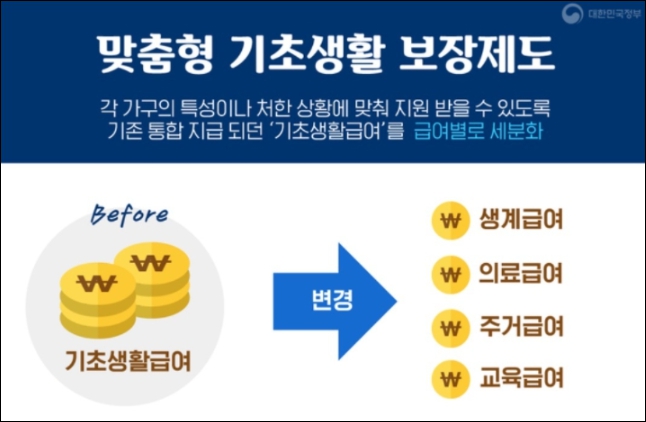 이러한 어려운 분들에게, 최소생계비에 모자라는 만큼 정부에서 지속적으로 여러 가지 방법으로 지원을 해주고 있습니다. 4가지 급여로 지원이 되며, 생계급여, 교육급여, 의료급여, 주거급여 등이 있습니다.