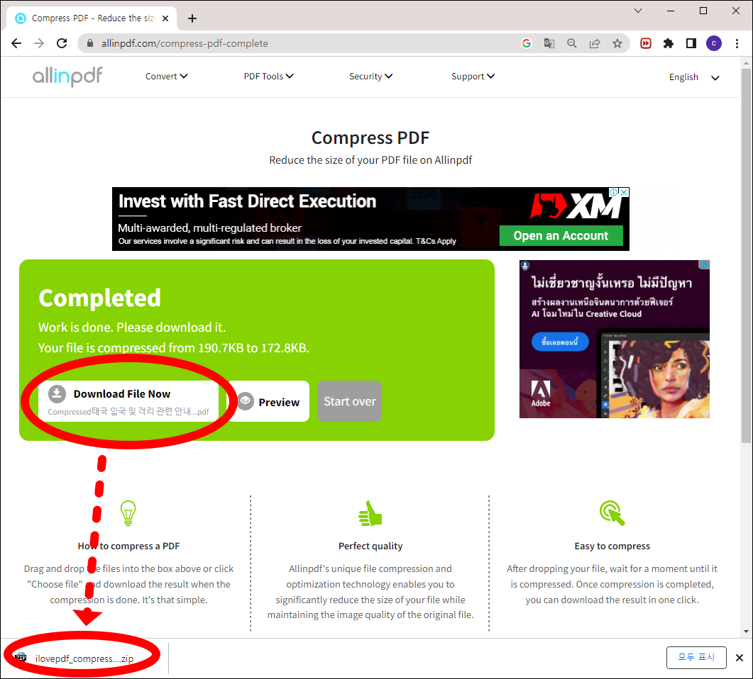 4) 탐색기가 열리면, 용량을 줄이기 원하는 pdf 파일을 선택해 주세요. 그럼, 아래처럼 바로 압축이 성공했는 메시지가 나오게 되는데, 이때 Download File Now를 눌러 주시면 압축이 완료된 파일이 아래의 그림처럼 다운로드됩니다.