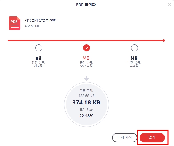 5) 보통단계의 압축단계를 선택하니 22.5% 정도의 압축이 되었네요. 열기 버튼을 눌러 주시면 압축이 완료된 파일을 열어서 확인이 가능합니다.