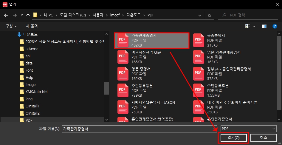 3) 파일 탐색기가 열리면, 용량을 줄이기 원하는 PDF파일을 아래와 같이 선택을 해주시고, 열기 버튼을 선택해 주세요.