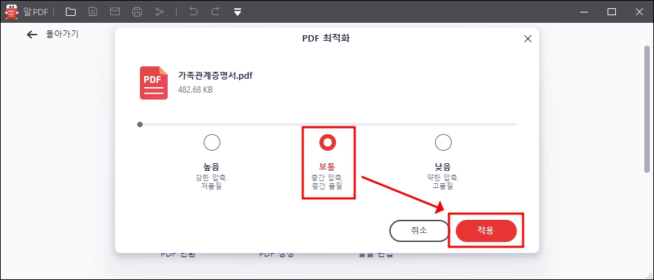 4) PDF 용량 줄이기는 3단계로 가능한데, 낮은 품질, 보통품질, 높은 품질 총 3가지입니다. 보통 품질을 선택해 보도록 하겠습니다.