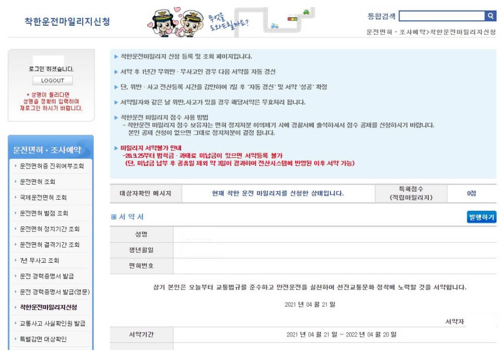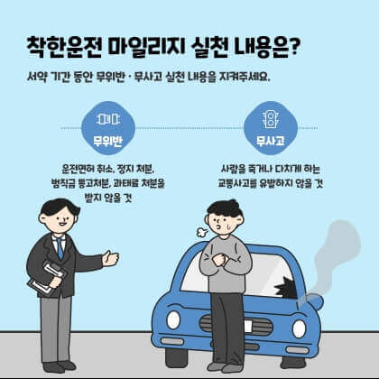 이 제도는 운전자가 착한 운전을 서약한 이후에 1년 동안 교통법규 위반을 하지 않고 무사고 준수 서약 내용을 지키면 1년에 10점씩 마일리지가 적립이 되는 제도입니다.