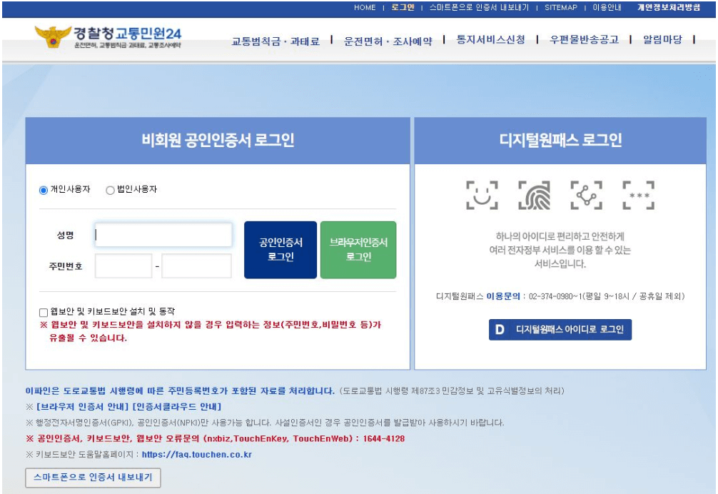 코로나 시대에 비대면 신청을 원하시는 분들 께서는 먼저 검색을 통해서나 아래의 이파인 링크를 통해 경찰청 교통민원 24(이파인) 홈페이지에 접속합니다.
