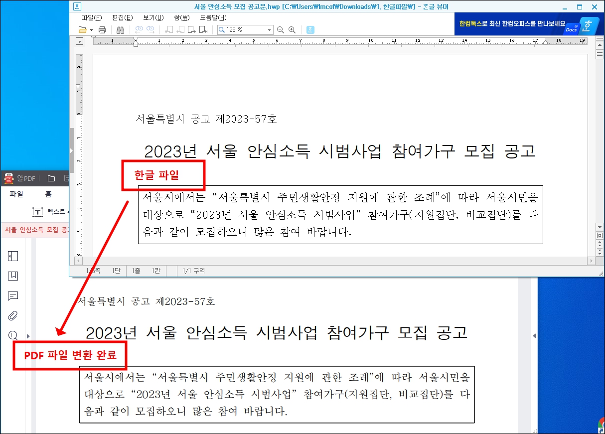 확인해 볼까요? 아래의 그림을 한번 보시면 체크가 가능 합니다. 기존의 HWP 파일이 PDF 파일로 똑같이 변경된 것을 보실 수 있습니다.
