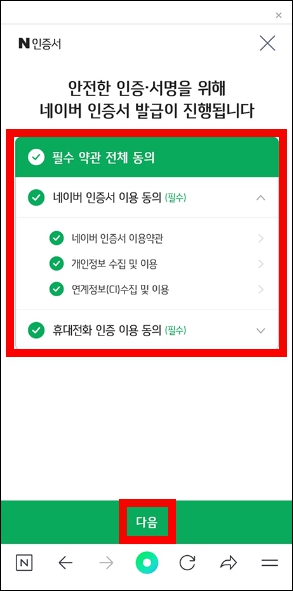 - 네이버 공동인증서 발급 약관동의를 진행 합니다.